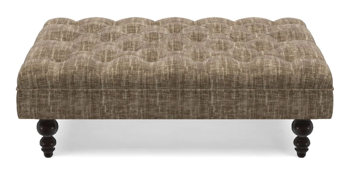 A traditionally styled, large, low rectangular footstool featuring classic buttoning and solid hardwood turned feet.