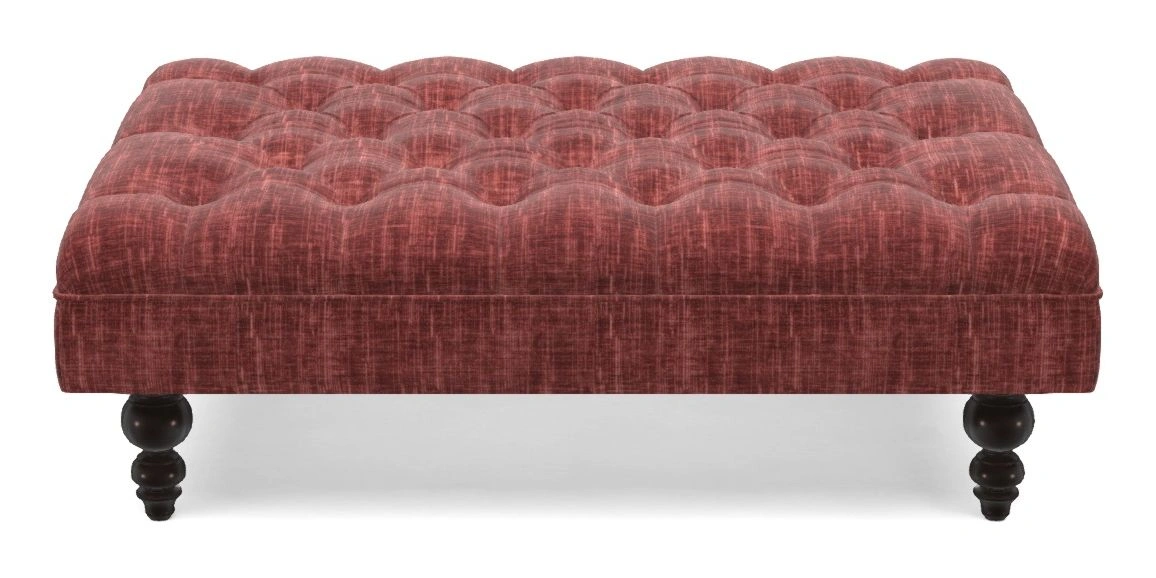 A traditionally styled, large, low rectangular footstool featuring classic buttoning and solid hardwood turned feet.