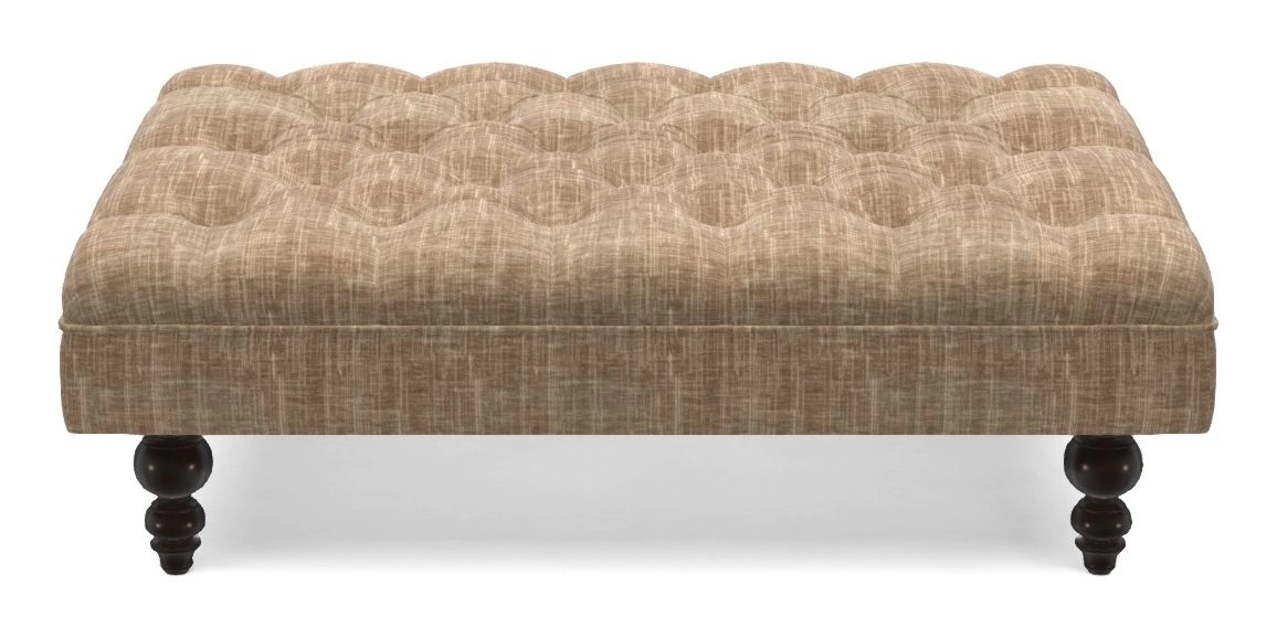A traditionally styled, large, low rectangular footstool featuring classic buttoning and solid hardwood turned feet.