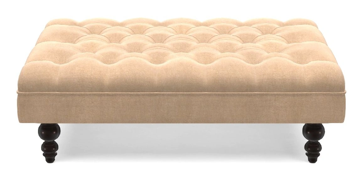 A traditionally styled, large, low rectangular footstool featuring classic buttoning and solid hardwood turned feet.