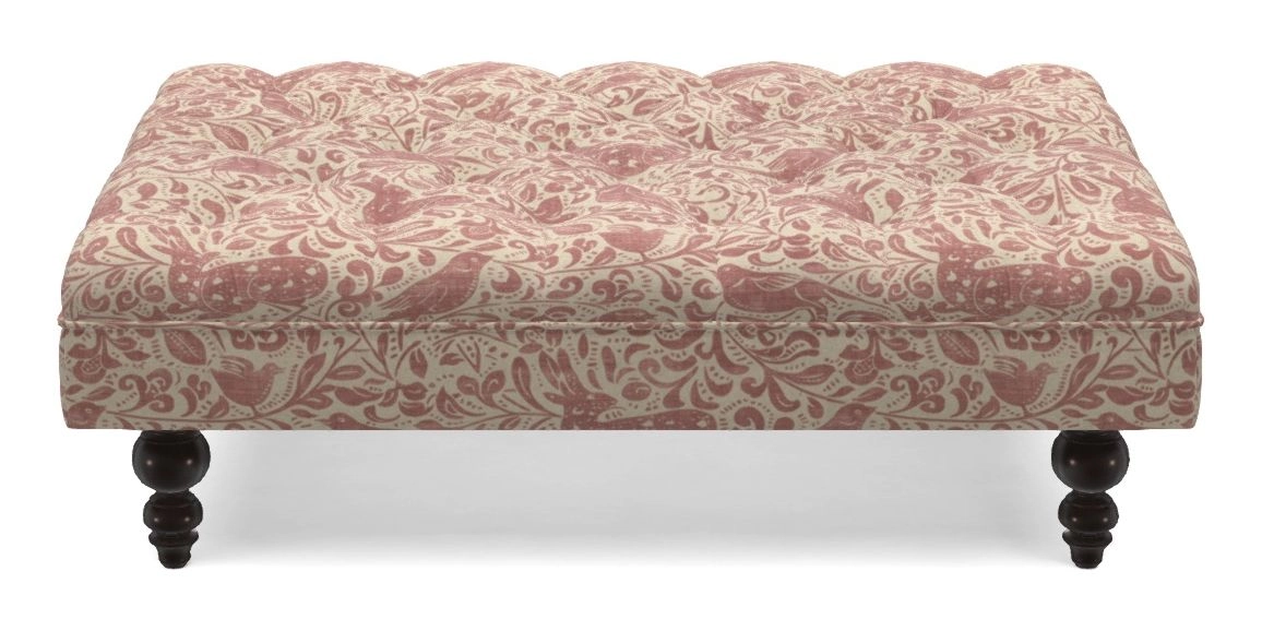 A traditionally styled, large, low rectangular footstool featuring classic buttoning and solid hardwood turned feet.