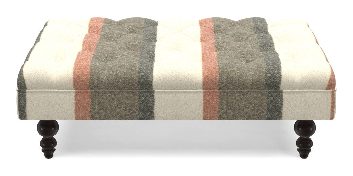 A traditionally styled, large, low rectangular footstool featuring classic buttoning and solid hardwood turned feet.