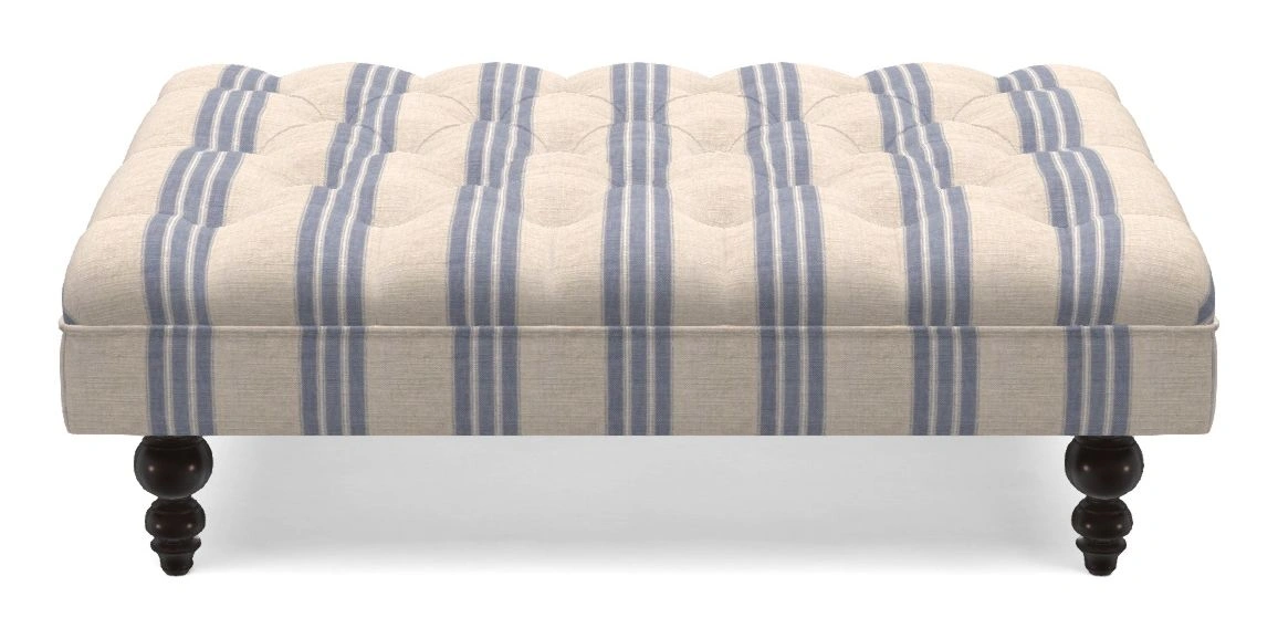 A traditionally styled, large, low rectangular footstool featuring classic buttoning and solid hardwood turned feet.
