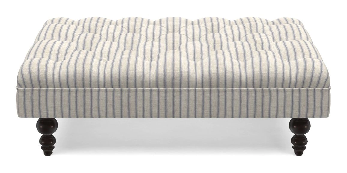 A traditionally styled, large, low rectangular footstool featuring classic buttoning and solid hardwood turned feet.