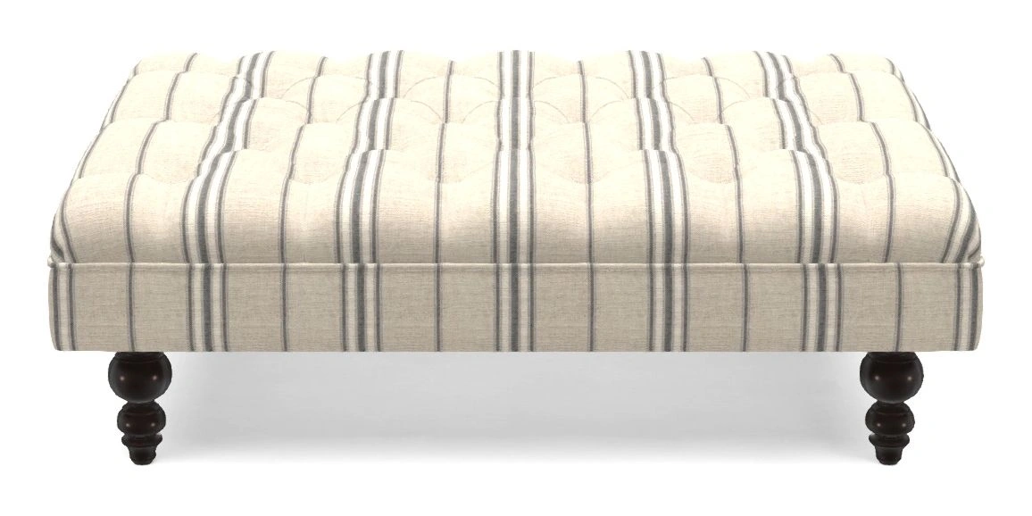 A traditionally styled, large, low rectangular footstool featuring classic buttoning and solid hardwood turned feet.