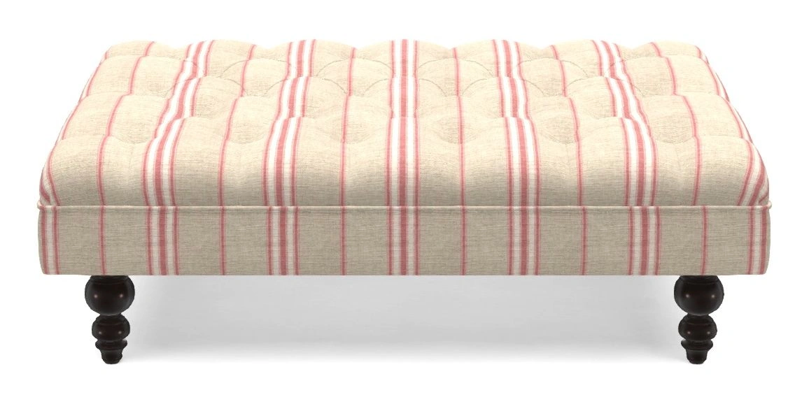 A traditionally styled, large, low rectangular footstool featuring classic buttoning and solid hardwood turned feet.