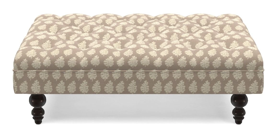 A traditionally styled, large, low rectangular footstool featuring classic buttoning and solid hardwood turned feet.
