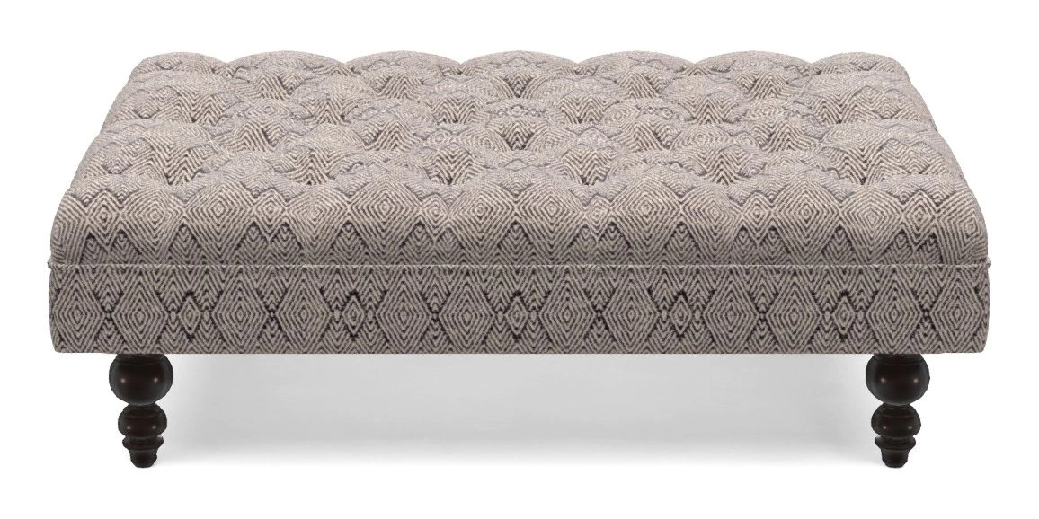 A traditionally styled, large, low rectangular footstool featuring classic buttoning and solid hardwood turned feet.