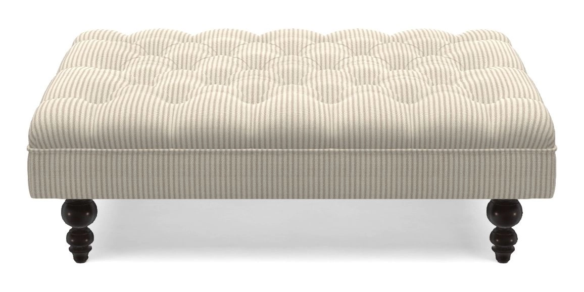 A traditionally styled, large, low rectangular footstool featuring classic buttoning and solid hardwood turned feet.
