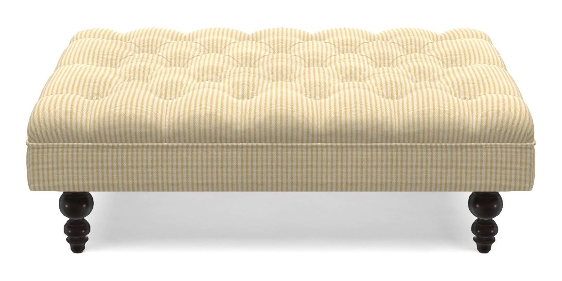 A traditionally styled, large, low rectangular footstool featuring classic buttoning and solid hardwood turned feet.