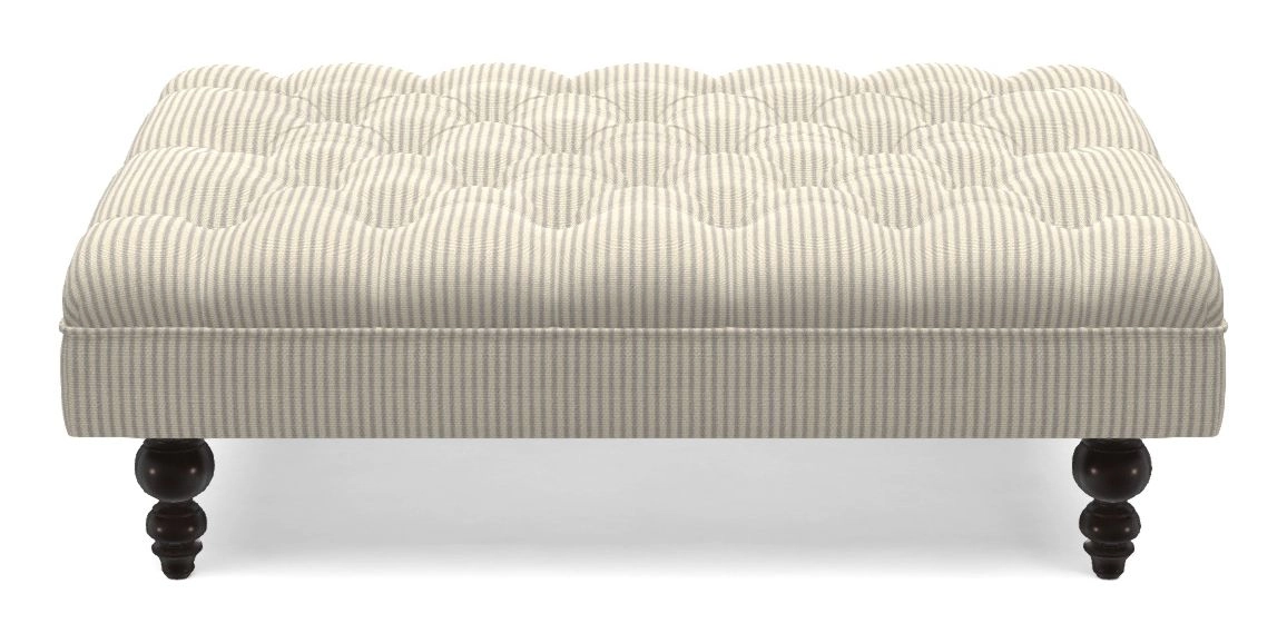 A traditionally styled, large, low rectangular footstool featuring classic buttoning and solid hardwood turned feet.