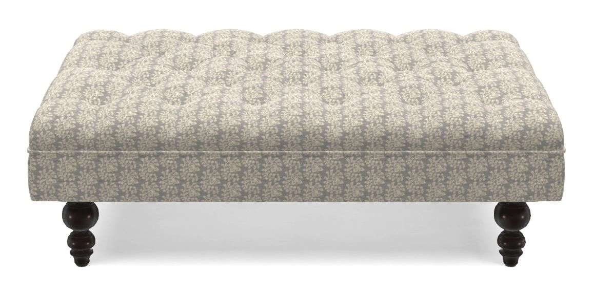 A traditionally styled, large, low rectangular footstool featuring classic buttoning and solid hardwood turned feet.