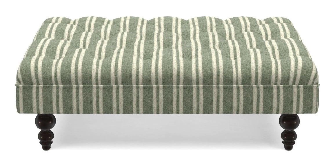A traditionally styled, large, low rectangular footstool featuring classic buttoning and solid hardwood turned feet.
