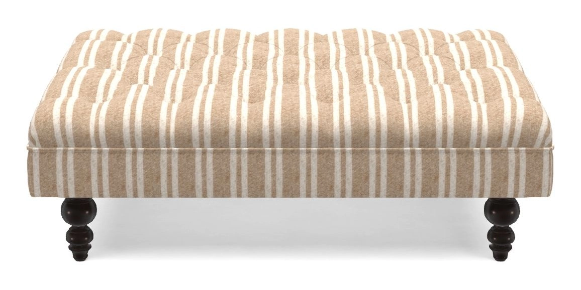 A traditionally styled, large, low rectangular footstool featuring classic buttoning and solid hardwood turned feet.
