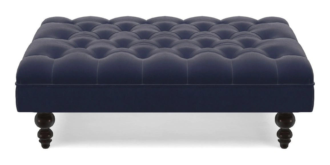 A traditionally styled, large, low rectangular footstool featuring classic buttoning and solid hardwood turned feet.