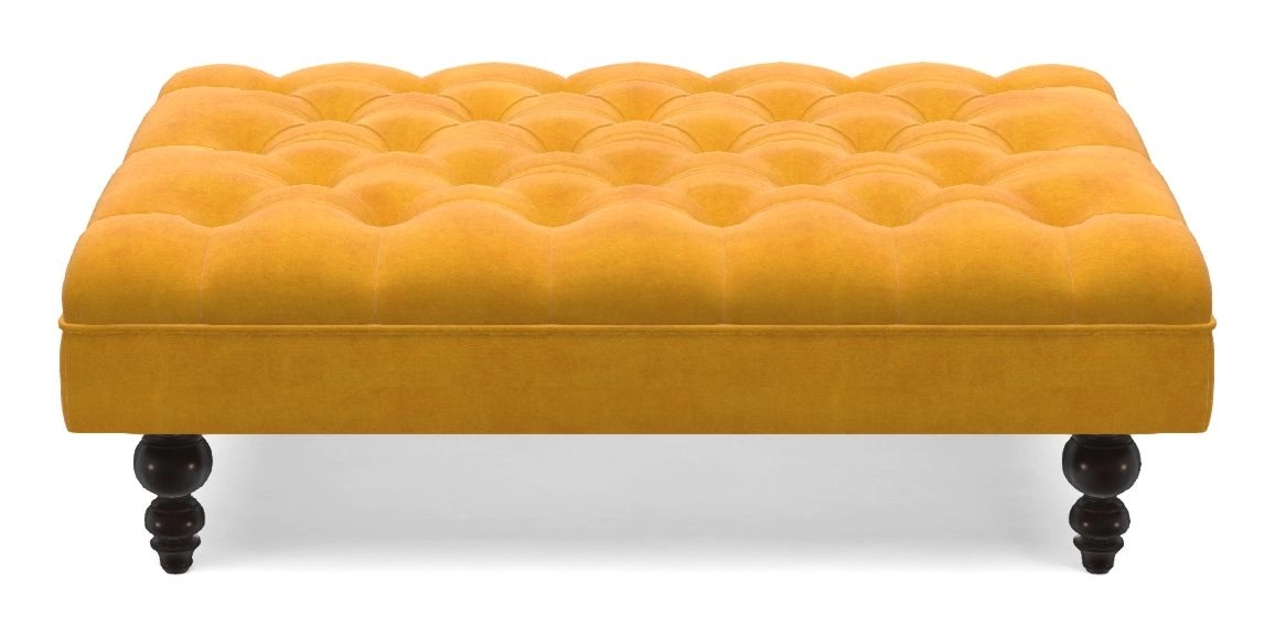 A traditionally styled, large, low rectangular footstool featuring classic buttoning and solid hardwood turned feet.