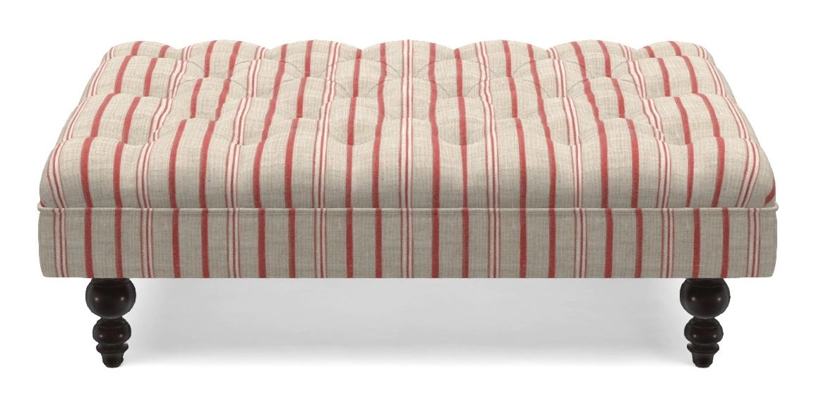 A traditionally styled, large, low rectangular footstool featuring classic buttoning and solid hardwood turned feet.