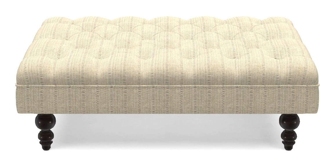 A traditionally styled, large, low rectangular footstool featuring classic buttoning and solid hardwood turned feet.