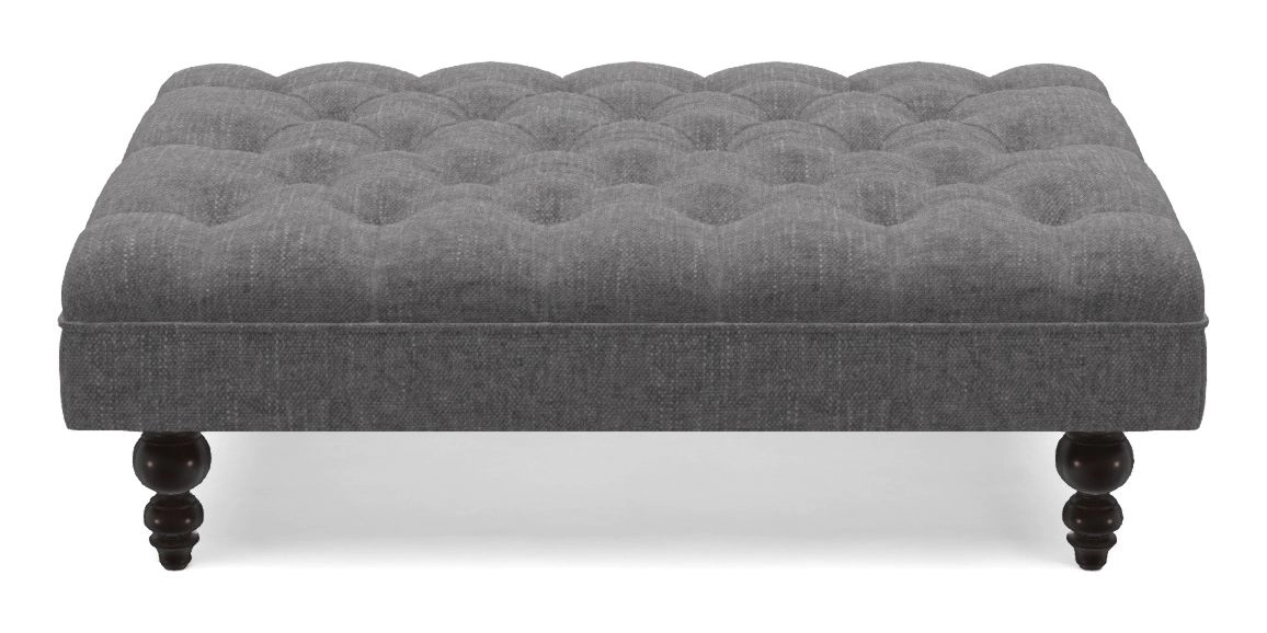 A traditionally styled, large, low rectangular footstool featuring classic buttoning and solid hardwood turned feet.