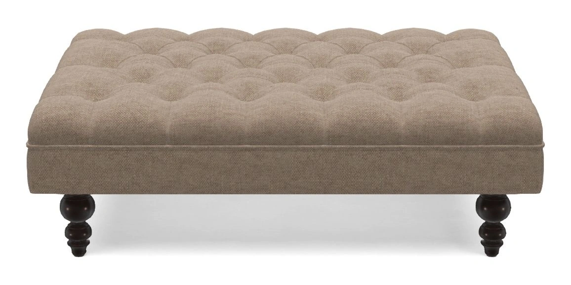 A traditionally styled, large, low rectangular footstool featuring classic buttoning and solid hardwood turned feet.