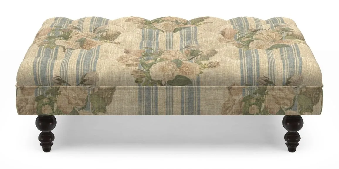 A traditionally styled, large, low rectangular footstool featuring classic buttoning and solid hardwood turned feet.