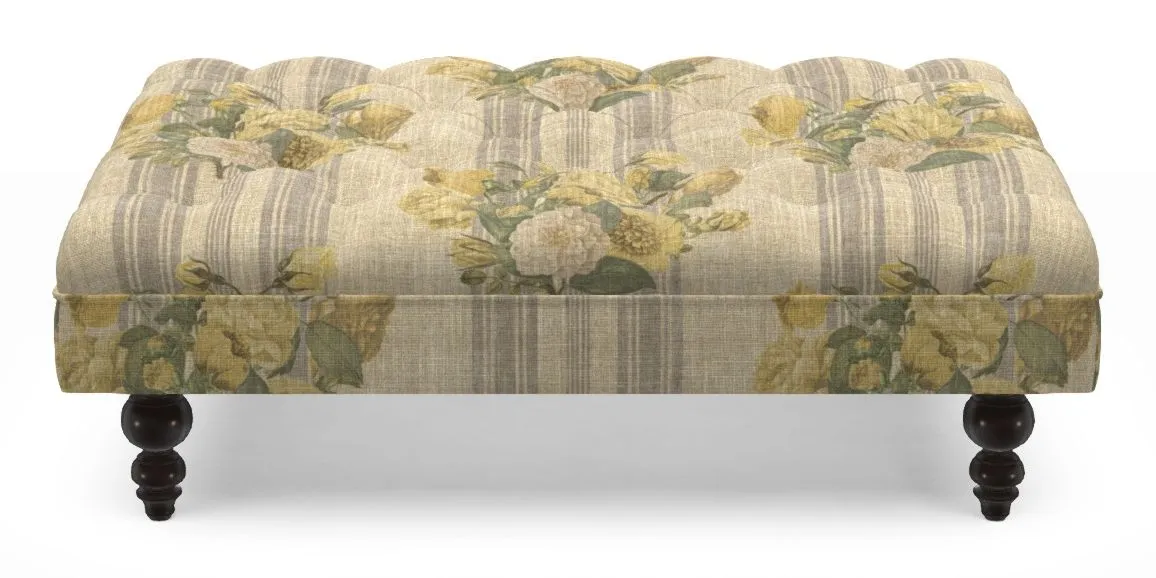 A traditionally styled, large, low rectangular footstool featuring classic buttoning and solid hardwood turned feet.