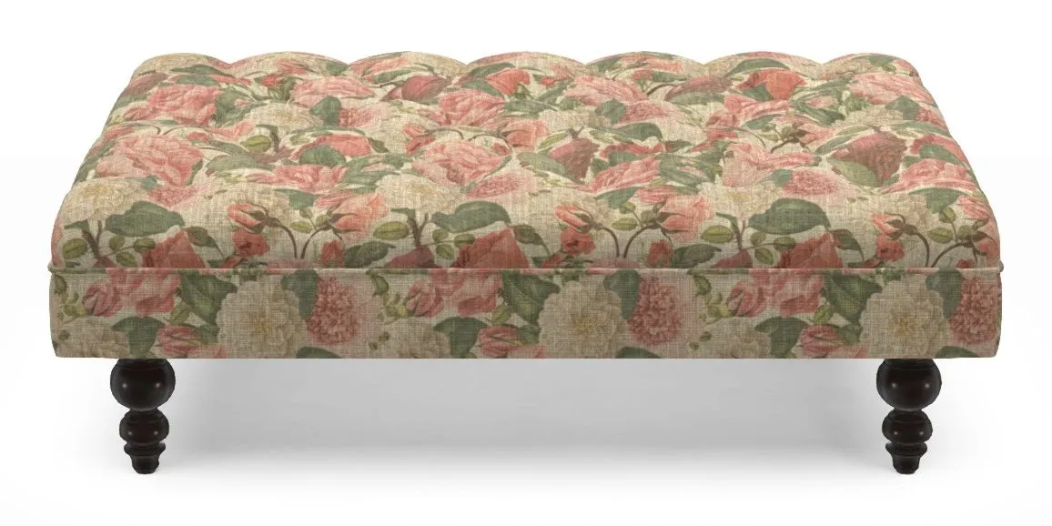 A traditionally styled, large, low rectangular footstool featuring classic buttoning and solid hardwood turned feet.