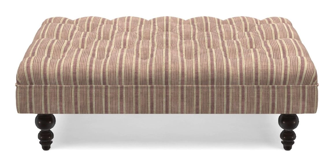 A traditionally styled, large, low rectangular footstool featuring classic buttoning and solid hardwood turned feet.