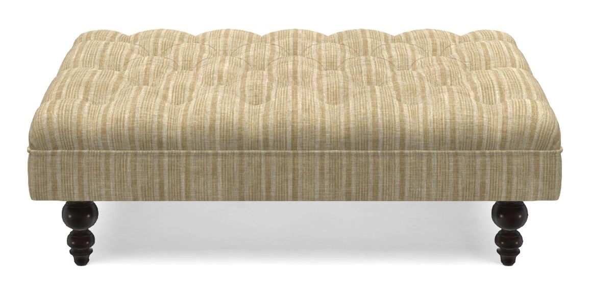 A traditionally styled, large, low rectangular footstool featuring classic buttoning and solid hardwood turned feet.
