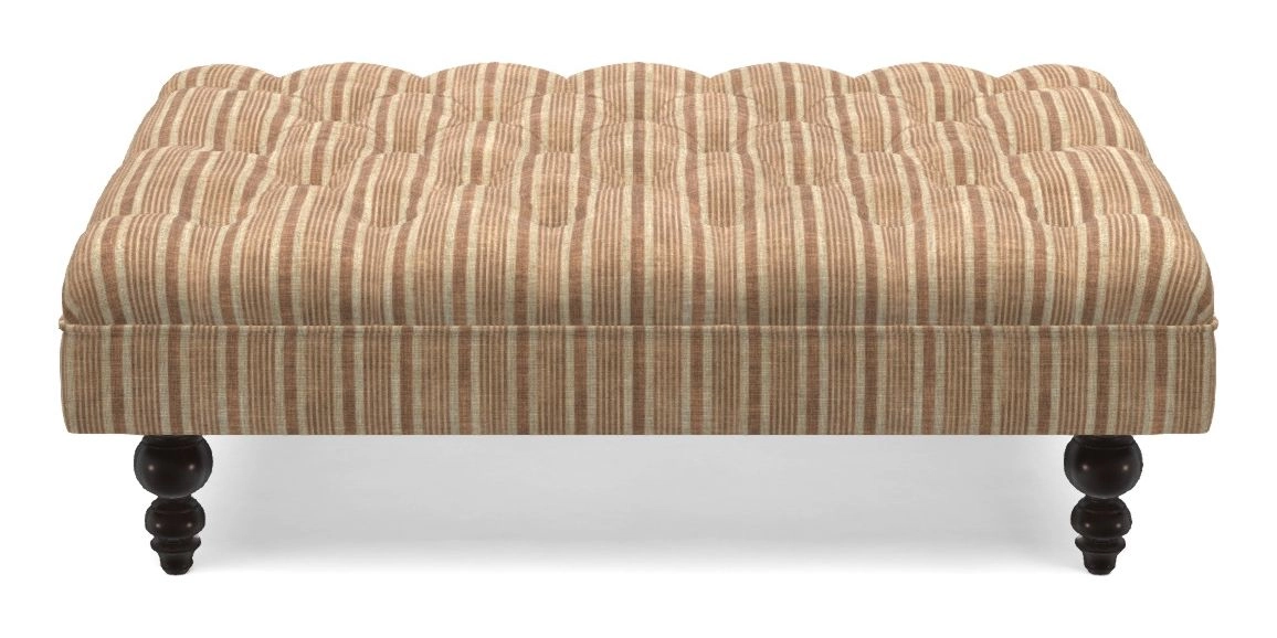 A traditionally styled, large, low rectangular footstool featuring classic buttoning and solid hardwood turned feet.