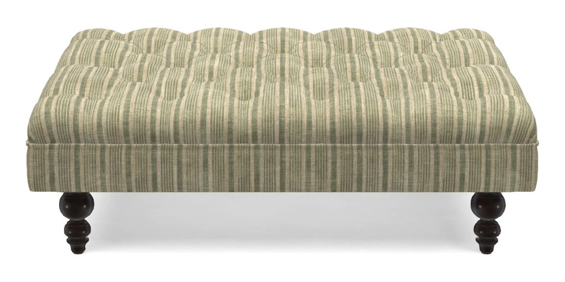 A traditionally styled, large, low rectangular footstool featuring classic buttoning and solid hardwood turned feet.
