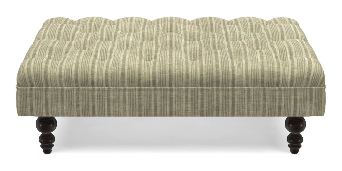 A traditionally styled, large, low rectangular footstool featuring classic buttoning and solid hardwood turned feet.