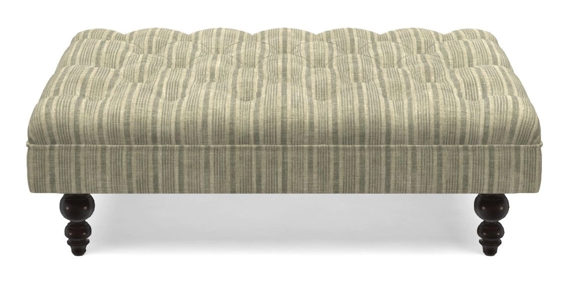 A traditionally styled, large, low rectangular footstool featuring classic buttoning and solid hardwood turned feet.