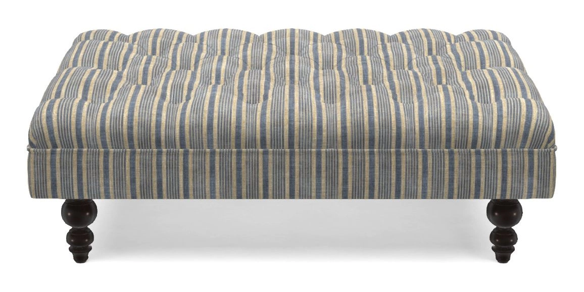 A traditionally styled, large, low rectangular footstool featuring classic buttoning and solid hardwood turned feet.