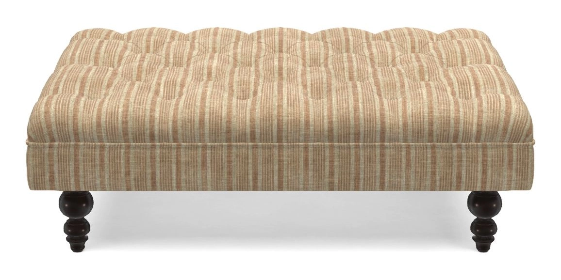 A traditionally styled, large, low rectangular footstool featuring classic buttoning and solid hardwood turned feet.