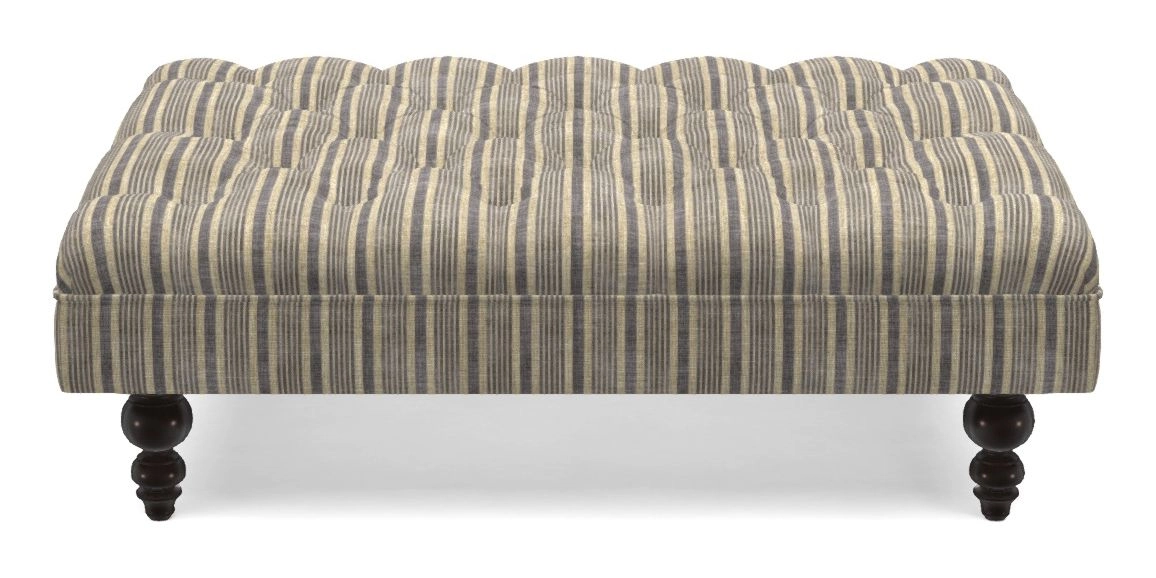 A traditionally styled, large, low rectangular footstool featuring classic buttoning and solid hardwood turned feet.