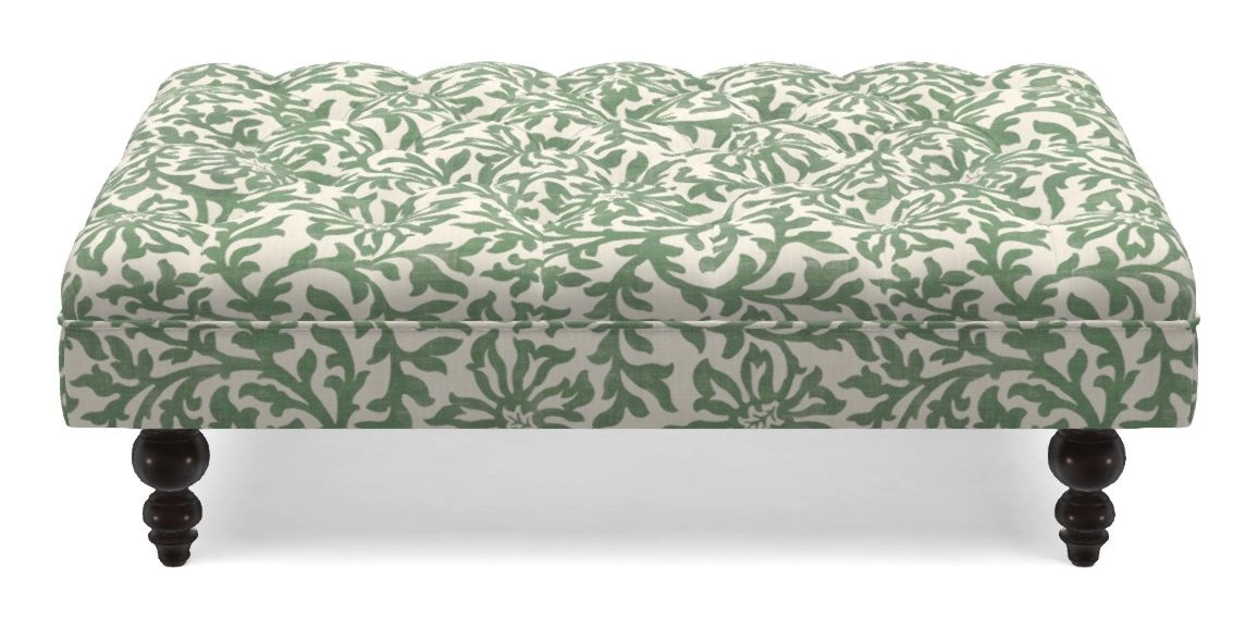A traditionally styled, large, low rectangular footstool featuring classic buttoning and solid hardwood turned feet.