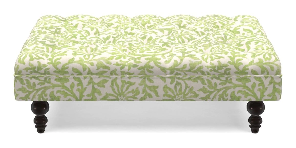 A traditionally styled, large, low rectangular footstool featuring classic buttoning and solid hardwood turned feet.