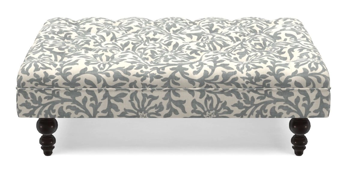 A traditionally styled, large, low rectangular footstool featuring classic buttoning and solid hardwood turned feet.