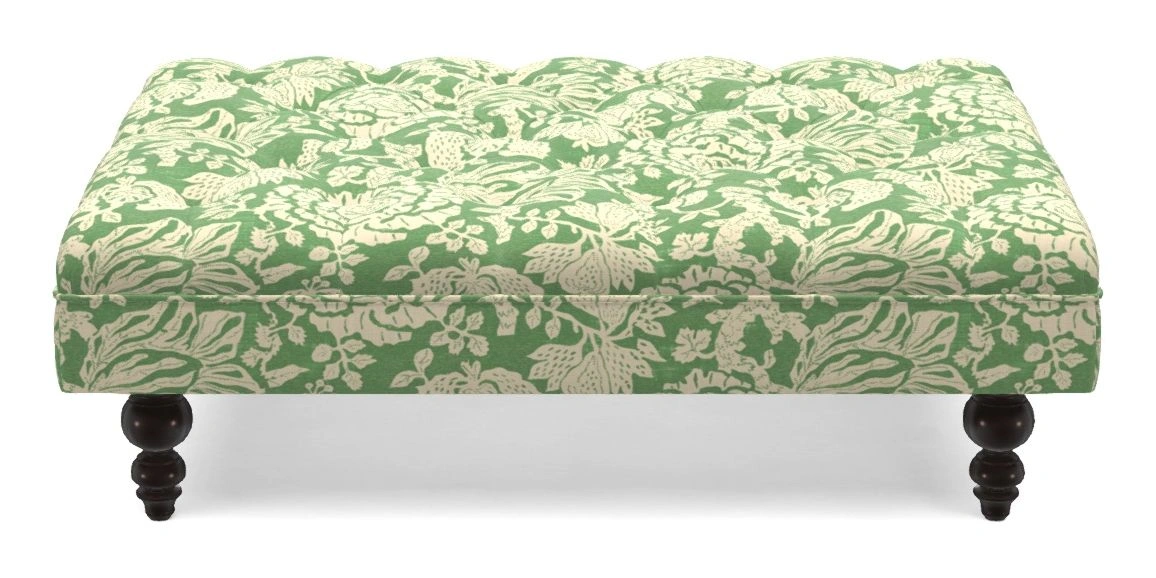 A traditionally styled, large, low rectangular footstool featuring classic buttoning and solid hardwood turned feet.