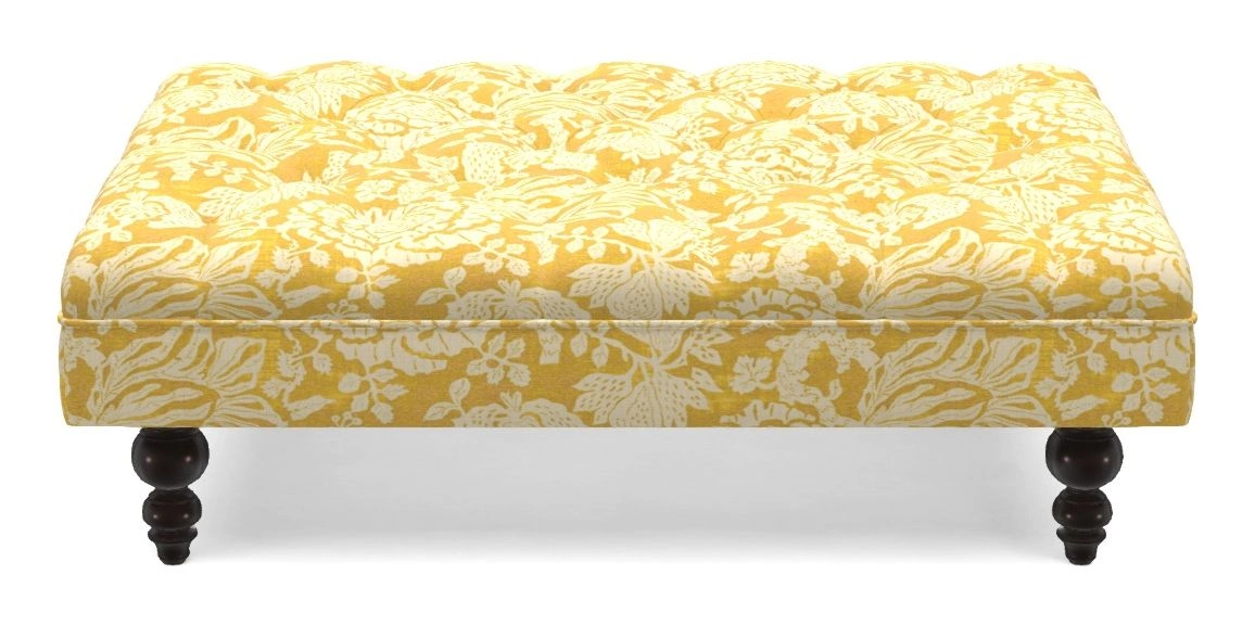 A traditionally styled, large, low rectangular footstool featuring classic buttoning and solid hardwood turned feet.