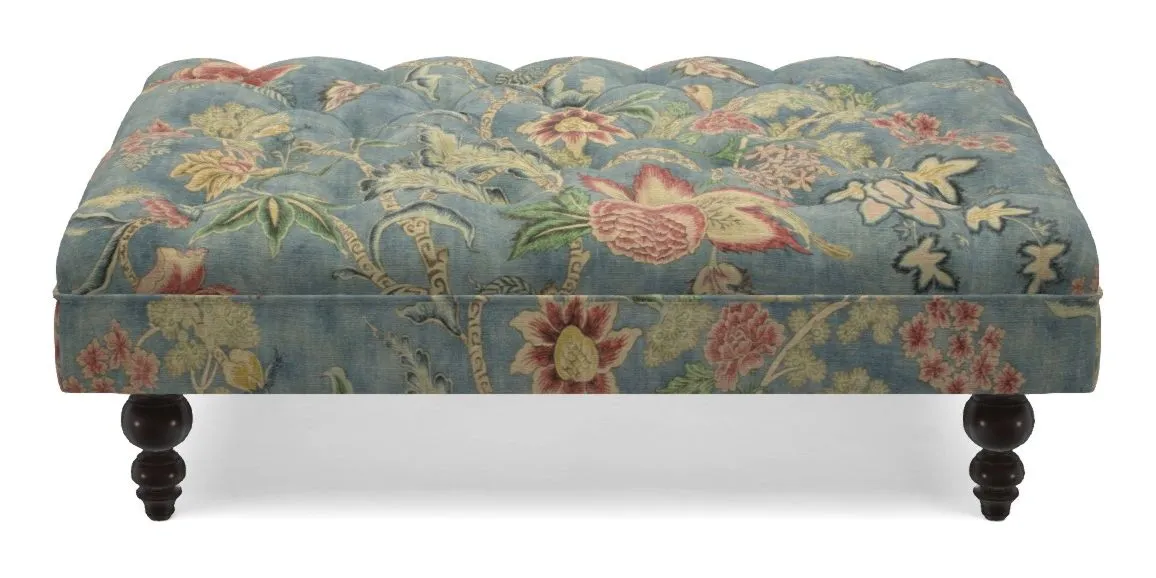 A traditionally styled, large, low rectangular footstool featuring classic buttoning and solid hardwood turned feet.