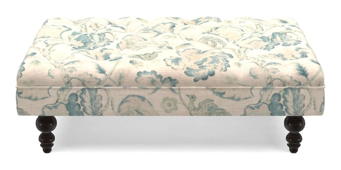 A traditionally styled, large, low rectangular footstool featuring classic buttoning and solid hardwood turned feet.