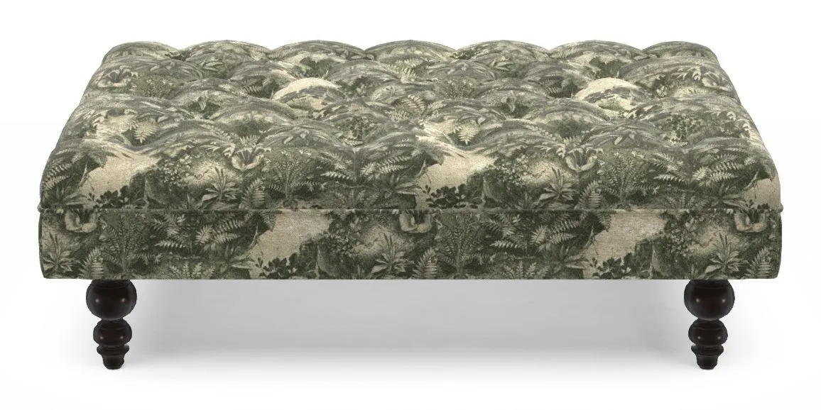 A traditionally styled, large, low rectangular footstool featuring classic buttoning and solid hardwood turned feet.