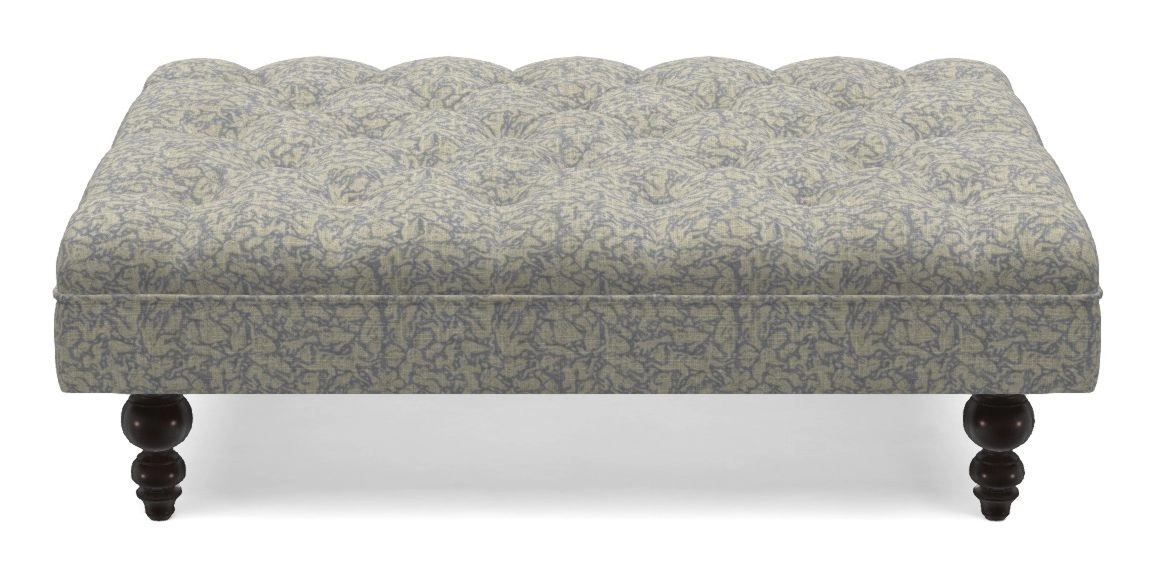 A traditionally styled, large, low rectangular footstool featuring classic buttoning and solid hardwood turned feet.