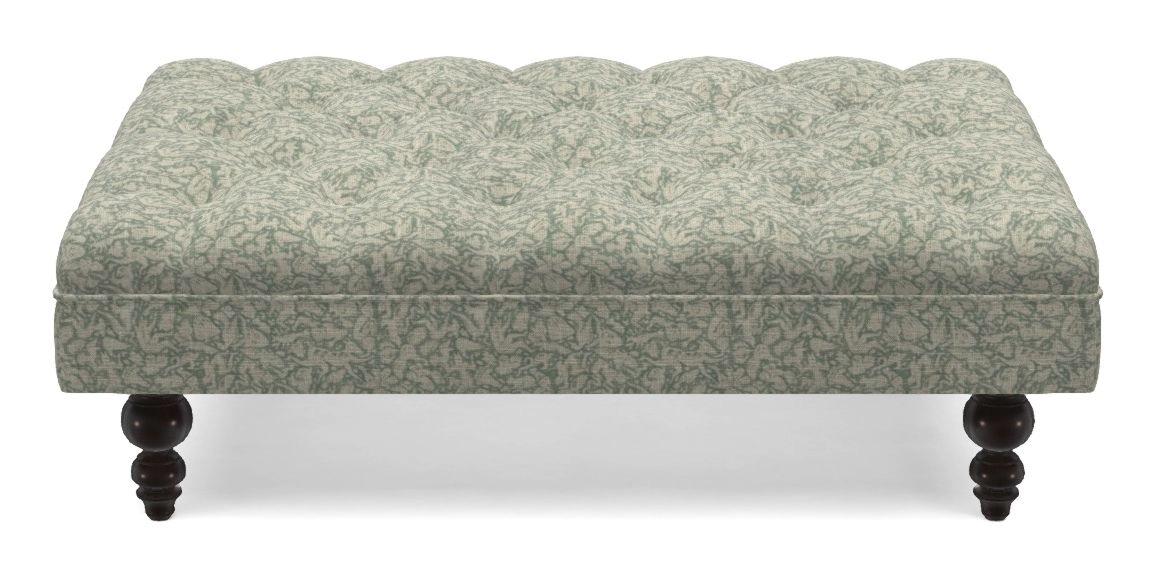 A traditionally styled, large, low rectangular footstool featuring classic buttoning and solid hardwood turned feet.
