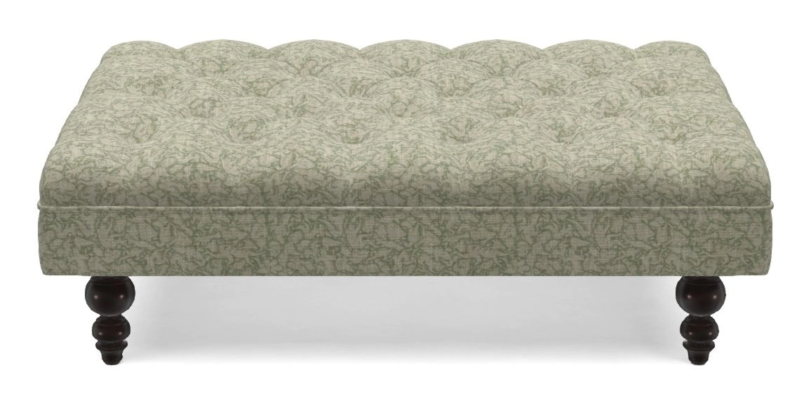 A traditionally styled, large, low rectangular footstool featuring classic buttoning and solid hardwood turned feet.