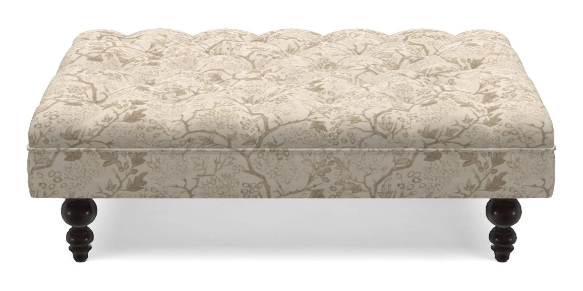 A traditionally styled, large, low rectangular footstool featuring classic buttoning and solid hardwood turned feet.