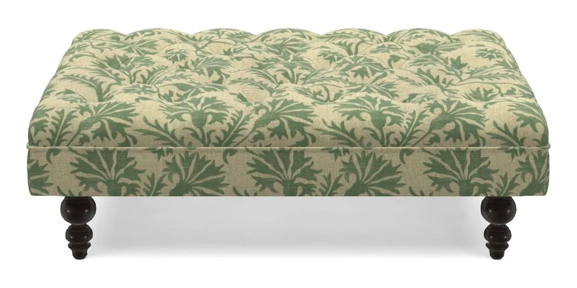 A traditionally styled, large, low rectangular footstool featuring classic buttoning and solid hardwood turned feet.