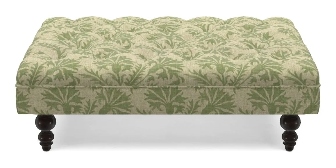 A traditionally styled, large, low rectangular footstool featuring classic buttoning and solid hardwood turned feet.